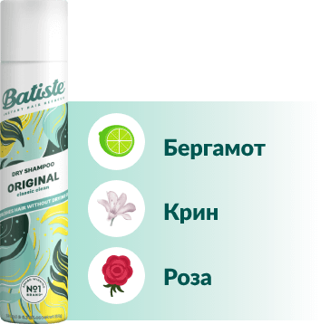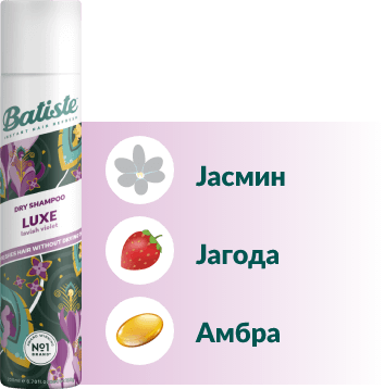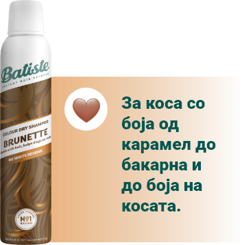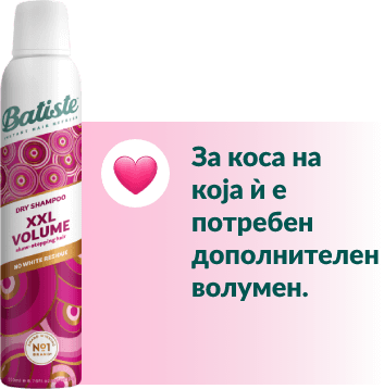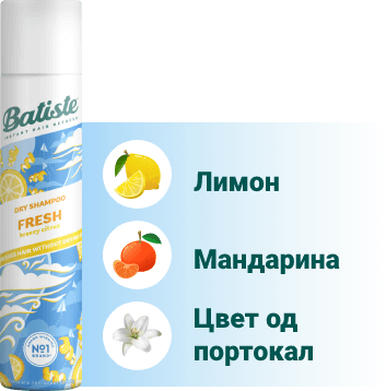 Долготрајниот процес на миење коса повеќе нема да биде пречка за твоите планови, благодарение на сувите шампони Батисте.Осмислени како совршено, едноставно и брзо решение, производите Батисте во спреј нежно го отстрануваат вишокот мрснотија и на твојата коса ѝ даваат дополнително чувство на свежина. Не оставаат бели траги, не ја лепат косата, туку ја прават лесна, лелеава и чиста - за сите типови коса и со мирисни ноти за сечиј карактер.